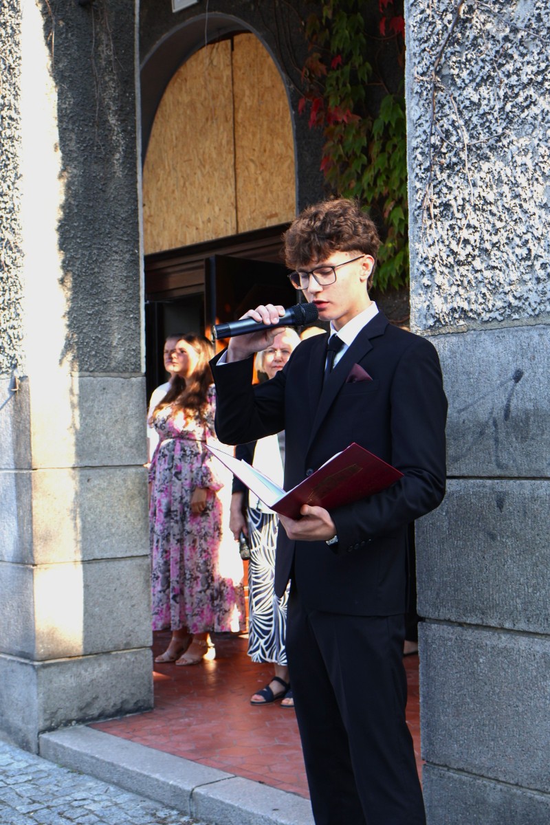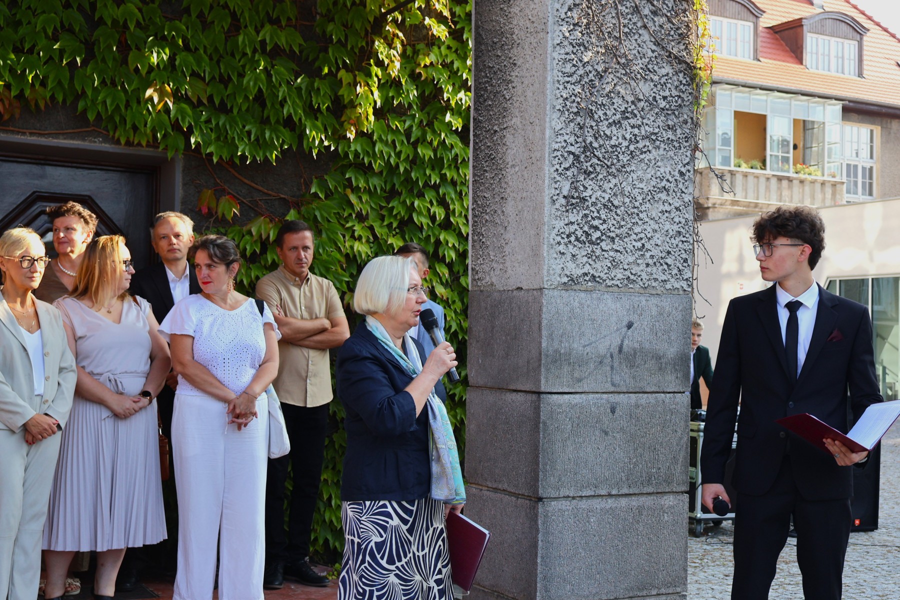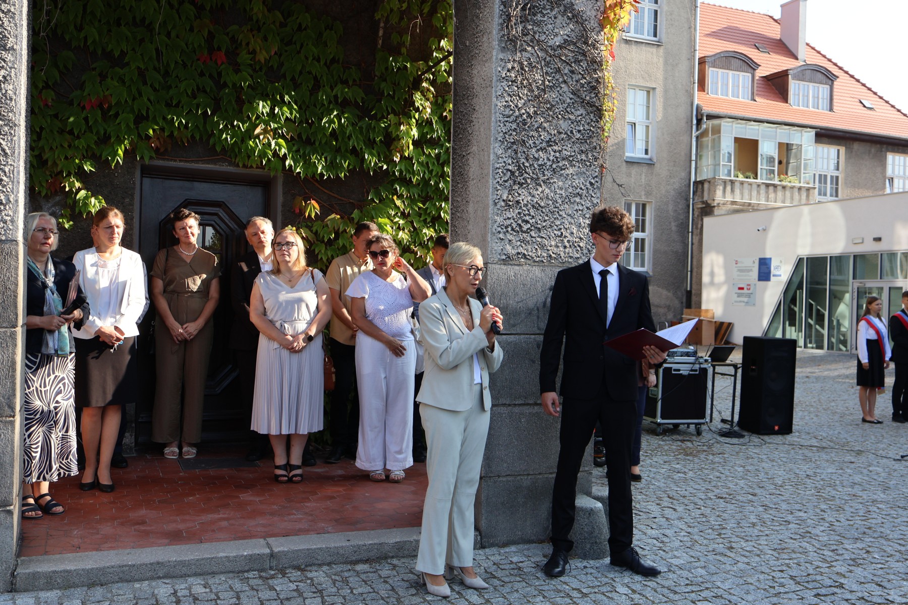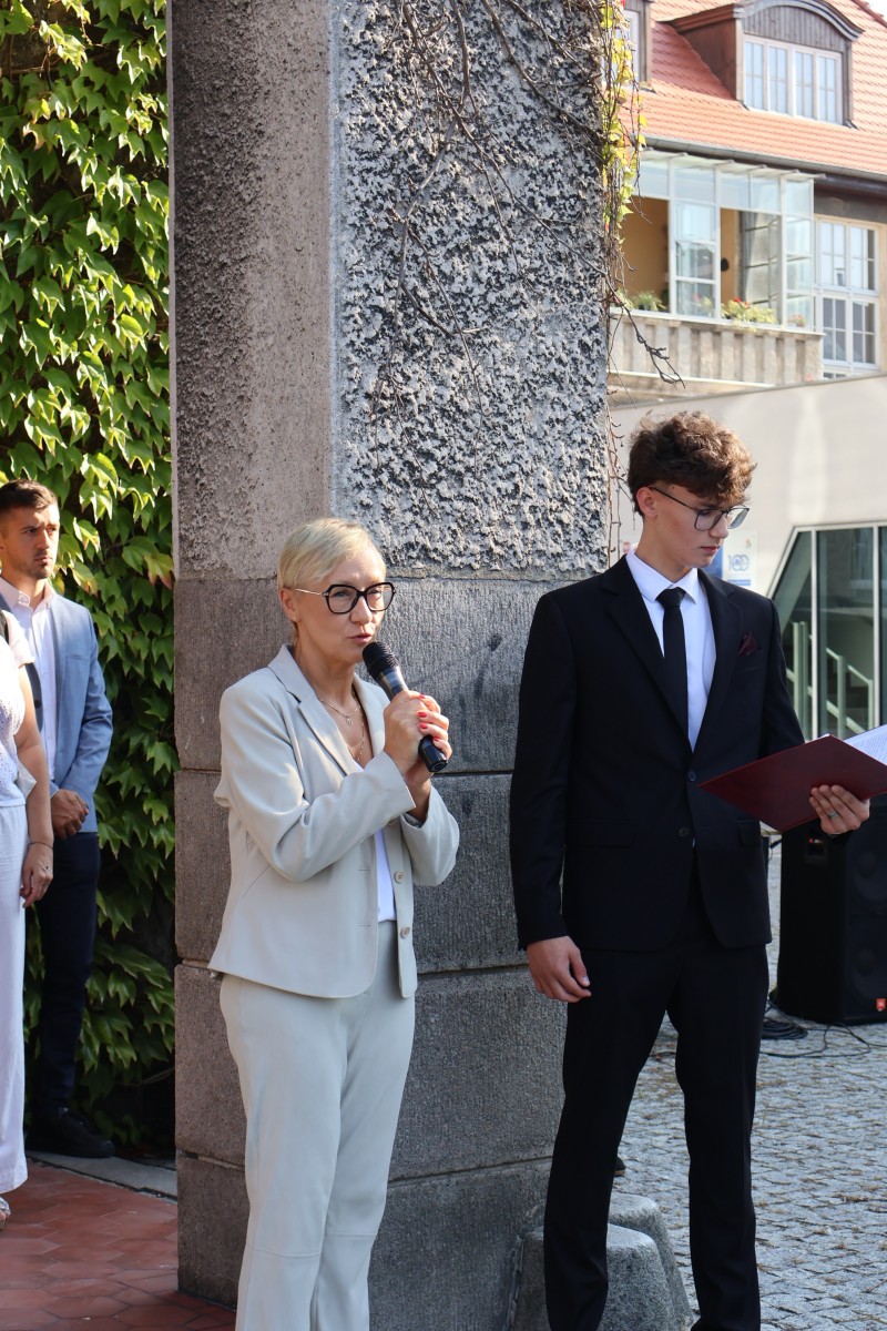 Przewodnicząca Rady Rodziców p. Katarzyna Kołcio-Kraus życzyła całej społeczności szkolnej udanego startu w nowym roku szkolnym 2025/2026, a maturzystom samych łatwych zadań na egzaminach maturalnych. Pani dyrektor Danuta Stefańska przedstawiła wychowawców klas pierwszych: p. Lidia Krzymińska - kl. 1, p. Maciej Adamek - kl. 1b, p. Karolina Szczepańska - kl. 1c, p. Małgorzata Falszewska- kl. 1d.